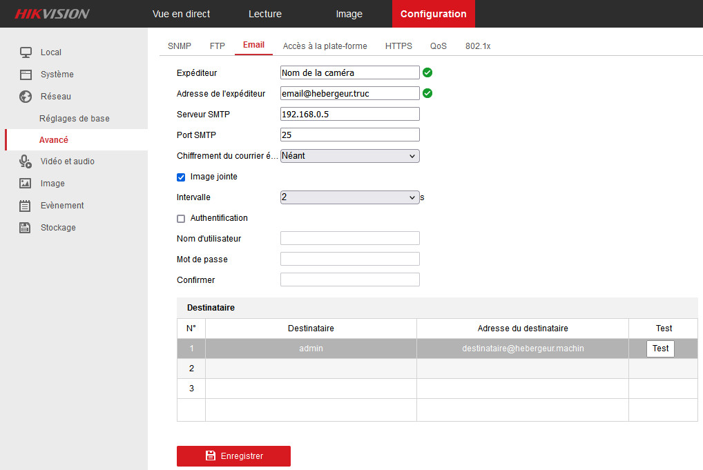 Si le test aboutit, vous pouvez passer à l’étape suivante en paramétrant vos équipements connectés pour qu’ils énvoient leurs e-mails vers votre relais d’e-mails local.Exemple de paramétrage sur une caméra de vidéosurveillance HikVision, puisque c’était la raison de la mise en place du relais d’e-mails sortants dans mon cas :